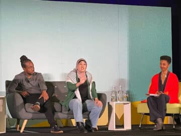 From left to right, Maurice Mitchell, Linda Sarsour, and Solana Rice are pictured participating in the open plenary titled “Centering Joy to Sustain our Movements” at the 2023 Just Future Summit in Oakland, CA.