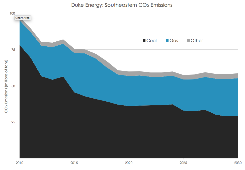 What Duke Energy is doing: Duke Energy is making good on its promise to continue deploying natural gas … but we wish they wouldn’t! Due to Duke Energy’s gas-heavy near-term plans, their current forecast does not include new or further waves of emissions reductions beyond 2020. Gas generation accounts for about 40% of all carbon (CO2) emissions in Duke Energy’s operations in the Southeast, and their plan to keep adding more means they are unlikely to reduce emissions much after 2020.