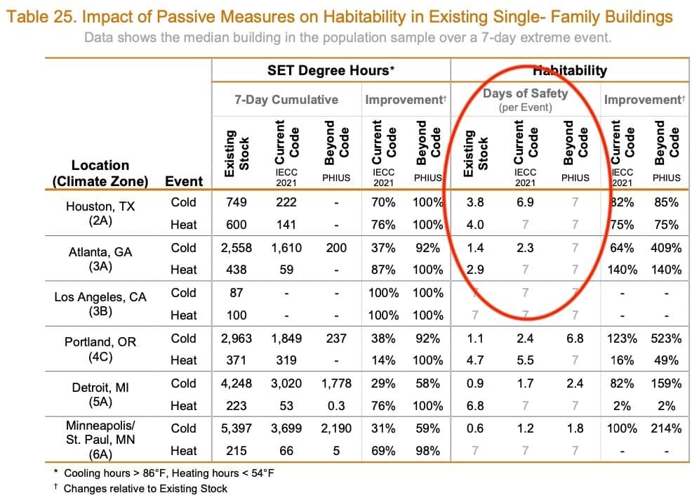Weatherizing existing average homes up to modern energy code standards would keep the home in safely habitable temperature ranges during a power outage for an additional 22 hours in Atlanta during a winter storm and an additional 3 days during a heat wave. It’s an additional 3.1 days of safety for a winter storm in Houston and 3 days of safety for a heat wave. See the table below for more information.